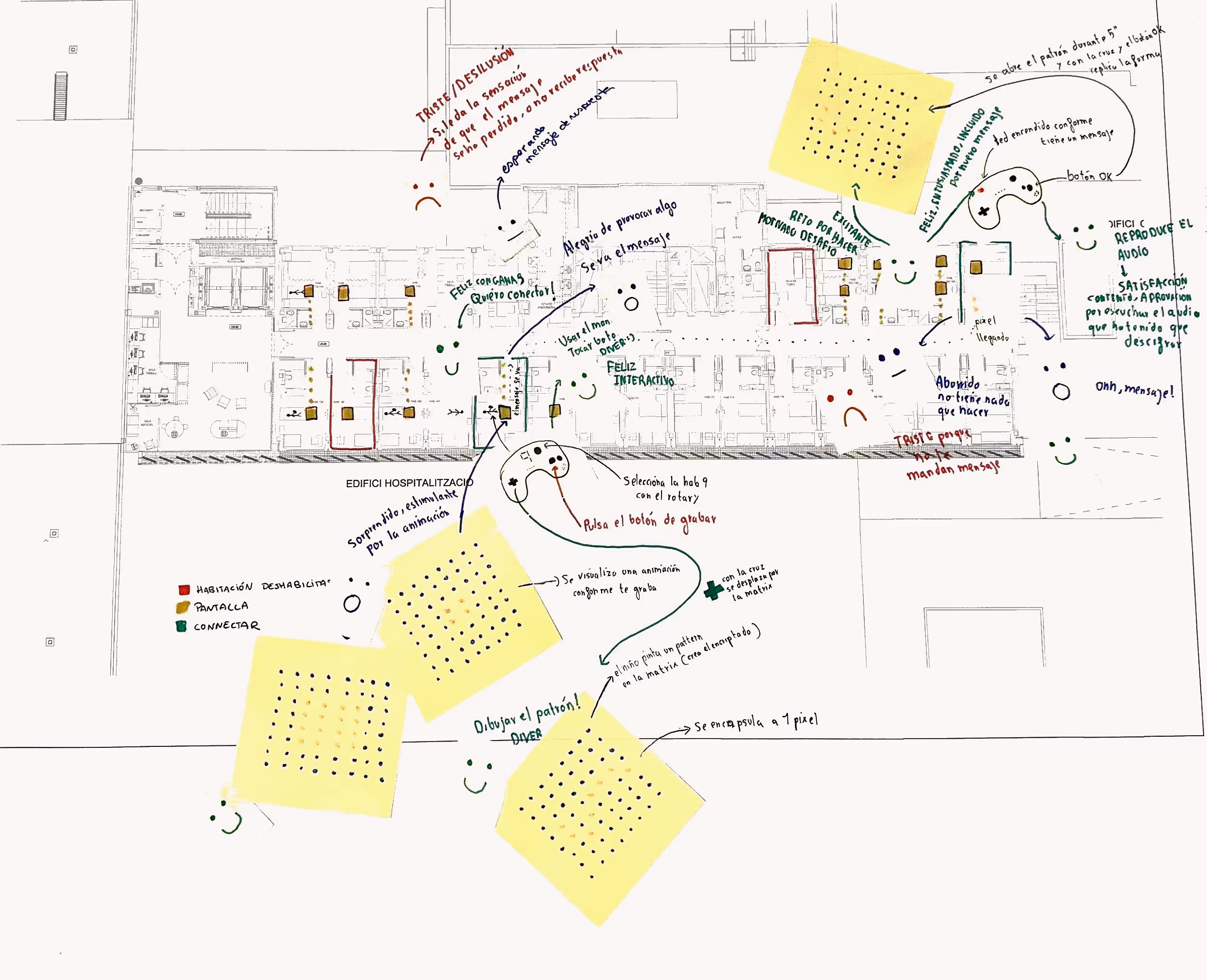 The reason why the message is encoded is to generate a communication space designed for patients, creating a new layer, like a small parallel society, that breaks away from hospital hierarchies. In this system, voice memos are shaped by the patient into visual patterns that must be memorized and replicated by the receiver in order to hear the voice message. This way, we stimulate mental activity through memory and the motivation for connection, even when physical movement is limited.