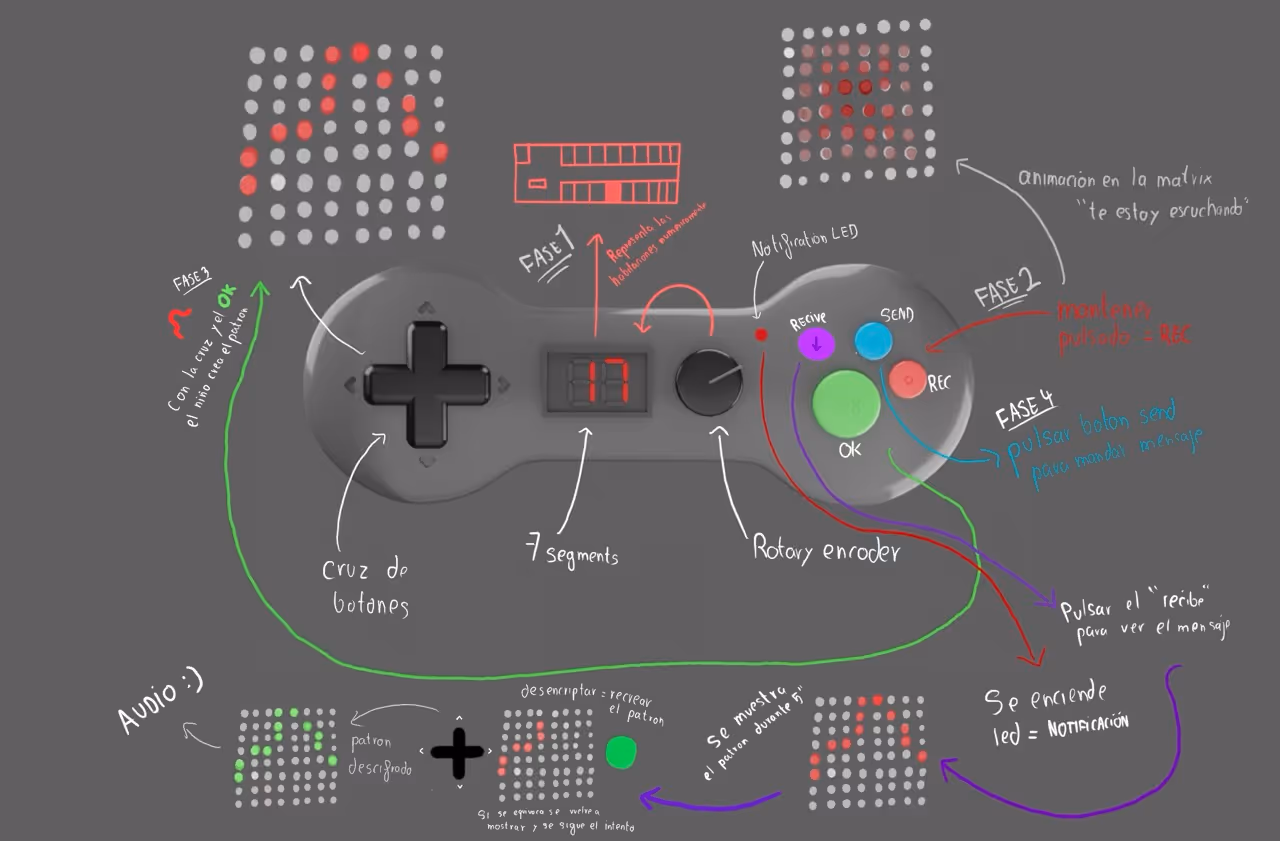 This project introduces an interactive experience at SJD Hospital for teenagers with minority diseases. We started from the belief that a process of hospitalization could trigger negative emotions, which may interfere with the healing process. Studies show that connection and social interaction reduce pain and improve recovery. For this reason, we propose Encoded, a voice communication system materialized in an artifact that gamifies social connection between patients in an encrypted way.